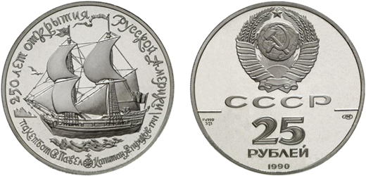 Die ersten beiden Ausgaben des Jahres 1990 zeigen das Schiff "St. Petr" mit dem Porträt von Kapitän Vitus Jonassen Bering (1680-1741) und das Schiff "St. Pavel".