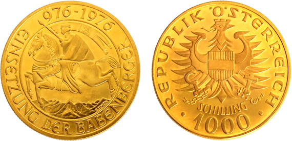 Die österreichische Goldmünze "1.000 Schilling Babenberger" wurde im Jubiläumsjahr 1976 anlässlich der Feierlichkeiten zu "1000 Jahre Einsetzung der Babenberger in Österreich" herausgegeben.