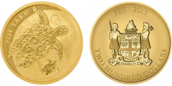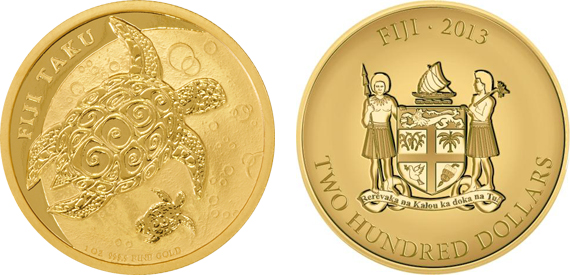 Die exotische "Fiji Taku"-Münze mit einem Schildkröten-Motiv wurde erstmalig im Jahr 2010 in Silber geprägt, ihr folgte das Pendant in Gold drei Jahre später.
