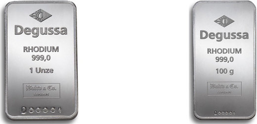 Im Jahr 2012 stellte das in London ansässige Unternehmen Baird & Co. Limited den ersten Rhodiumbarren vor. In Kooperation mit der Degussa Goldhandel GmbH aus Frankfurt werden der 1 Unzen und der 100 Gramm Rhodiumbarren exklusiv unter dem Degussa-Label in Deutschland und in der Schweiz vermarktet.