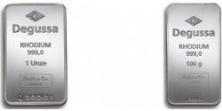 | 1 oz | Degussa Rhodiumbarren | ab 2013 | geprägt | 999 | 31,11 g | 41,20 x 24,40 x 2,50 mm |