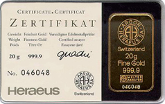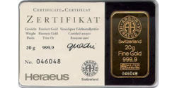 | 20 g | Heraeus Kinebar-Goldbarren | geprägt | 9999 | 20,00 g | 40,40 x 23,30 x 1,30 mm |