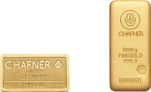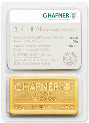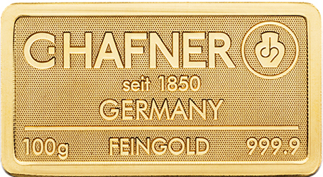 | 100 g | C. Hafner Goldbarren | geprägt | 9999 | 100,00 g | 55,00 x 30,00 x 3,60 mm |