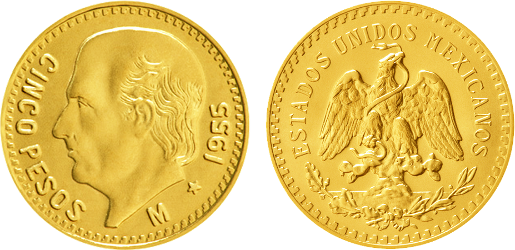 Die 5-Peso-Goldmünze, die auch unter dem Namen "1/2 Hidalgo" bekannt ist, zeigt das Kopfportrait des mexikanischen Freiheitskämpfers Miguel Hidalgo y Costilla (1753-1811). Hidalgo war Pfarrer und Professor für Theologie und begann den bewaffneten Freiheitskampf gegen die spanische Besatzungsmacht. Nach Miguel Hidalgo wurden der mexikanische Bundesstaat Hidalgo, die Stadt Dolores Hidalgo, der Asteroid 944 Hidalgo sowie das Fußballstadion Estadio Hidalgo benannt.