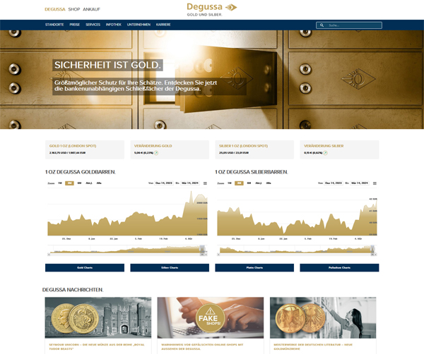 Das Handelsunternehmen biete in ihren Niederlassungen und im Onlineshop eigene Edelmetallbarren (Gold, Silber, Platin und Palladium) mit dem bekannten rautenförmigen Sonne-/Mond-Logo und dem Degussa-Schriftzug an. Vervollständigt wird das Sortiment durch eine breite Auswahl an Investmentmünzen.