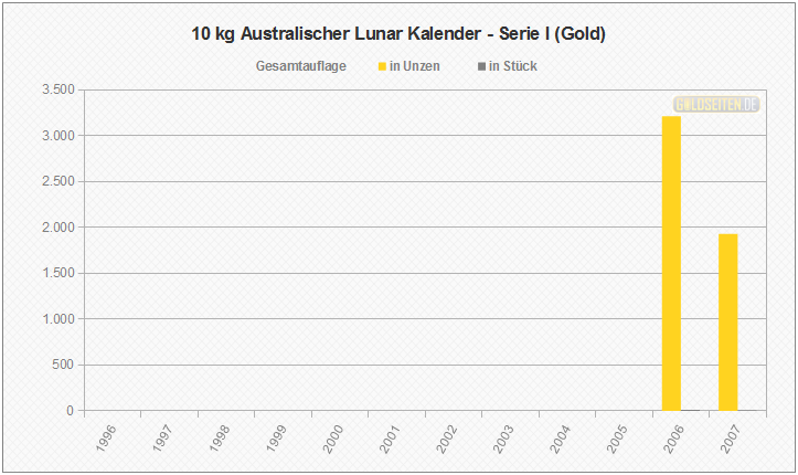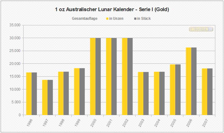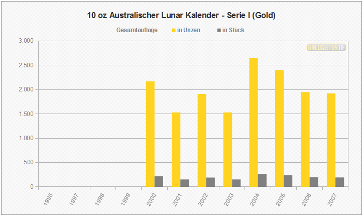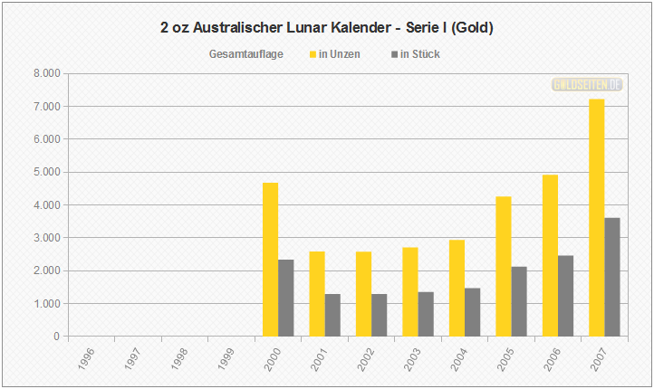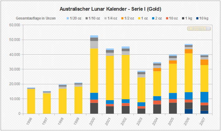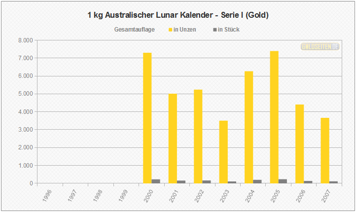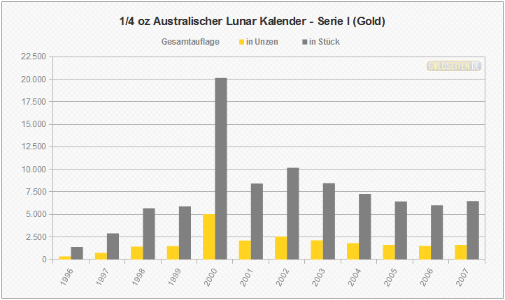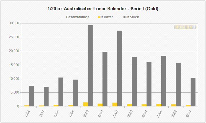 Legende/Erklärung: Der Australischen Lunar Goldmünzen (Serie I)" (aktuelle Preise) wurden im Zeitraum von 1996 bis 2007 von der australischen Perth Mint geprägt, ehe im Jahr 2008 eine zweite Serie an den Erfolg der ersten australischen Lunar-Goldmünzen anknüpfte. Die hier dargestellten Statistik beruhen auf dem Datenmaterial der Münzprägestätte und berücksichtigen keinerlei Ausführungen in Polierter Platte, Hochrelief oder vergleichbare Sonderausgaben.