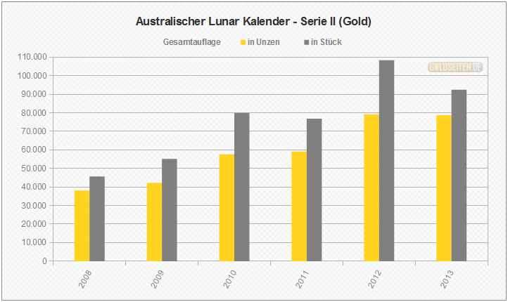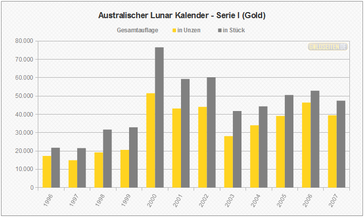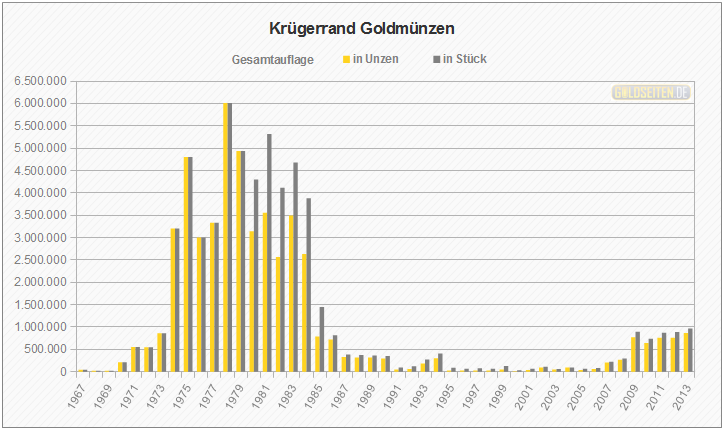 Die Auflagen im DetailLegende/Erklärung: Der American Buffalo, die American Gold Eagle, die britische Britannia (bis 2012, ab 2013), der südafrikanische Krügerrand, die australische Lunar-Goldmünzen Serie I und Serie II, der mexikanische Libertad, die kanadische Maple Leaf, die australischen Nugget bzw. Känguru Goldmünzen, der chinesische Panda und der Wiener Philharmoniker gehören zu den klassischen und weltweit bekannten Anlagemünzen (aktuelle Preise). Das in die Statistik eingeflossene Zahlenmaterial dieser Goldmünzen stammt von den staatlichen Münzprägestätten. Welche Münzgrößen im Detail in die jeweilige Auflagenstatistik berücksichtigt wurde, ist auf der jeweils verlinkten Einzelseite zu finden.