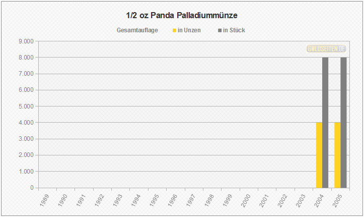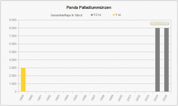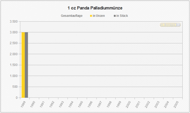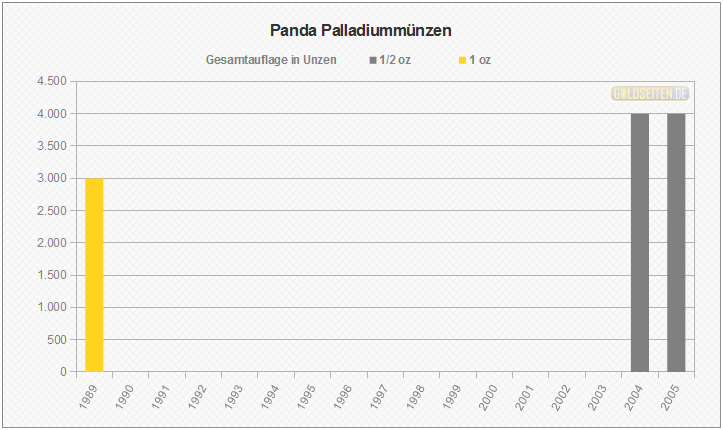 Legende/Erklärung: Die chinesische Panda-Anlagemünze in Palladium (aktuelle Preise) wurde 1989, 2004 und 2005 geprägt. Da es die Münze in diversen Auflagen auch in Gold, Silber und Platin gibt, soll der Palladium-Panda hier der Vollständigkeit halber mit aufgeführt werden, obgleich er nur sporadisch und ausschließlich als Polierte Platte-Ausführung produziert wurde. Die unterschiedlichen Motive wurden von der People´s Bank of China bestimmt, die Vermarktung erfolgte über die China Platin Coin Inc. Die Statistik der Panda Palladiummünzen basiert auf dem Datenmaterial der chinesischen Notenbank.