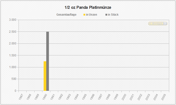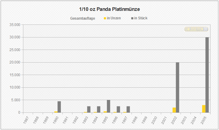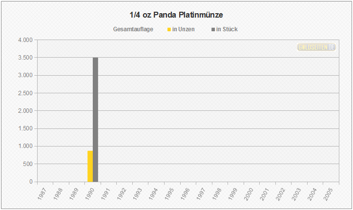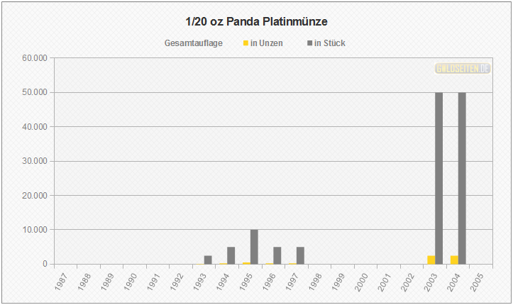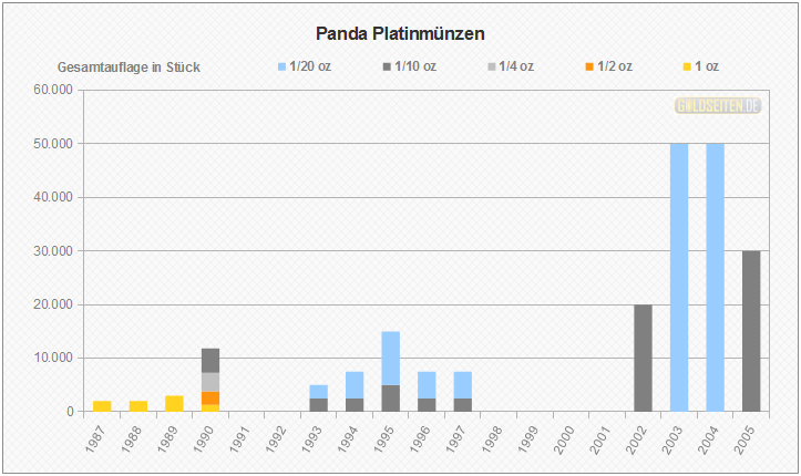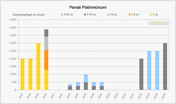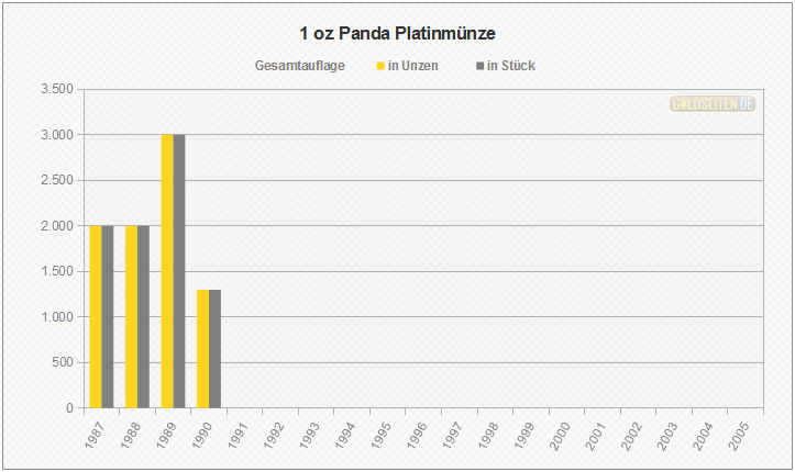 Legende/Erklärung: Die chinesische Panda-Anlagemünze in Platin (aktuelle Preise) wurde von 1982 bis 2005 geprägt. Den Panda gibt es auch in Gold, Silber und Palladium. Das jährlich wechselnde Münzmotiv wird von der People´s Bank of China ausgewählt, die Vermarktung erfolgt über die China Platin Coin Inc. Die Statistik der Panda Platinmünzen basiert auf dem Datenmaterial der chinesischen Notenbank, und berücksichtigt im Gegensatz zu den meisten hier aufgeführten Gattungen aufgrund ihrer Auflagenstärke auch die Polierte Platte-Ausführungen.