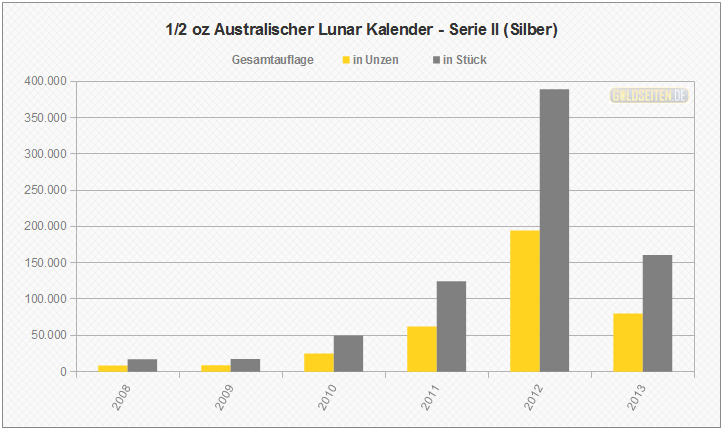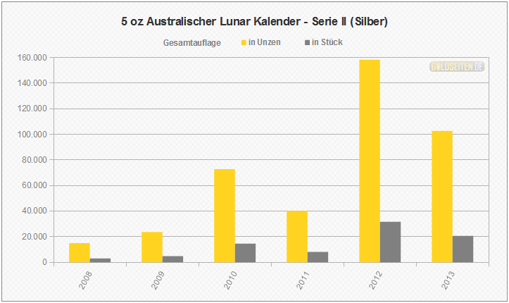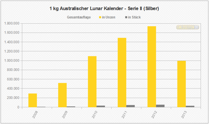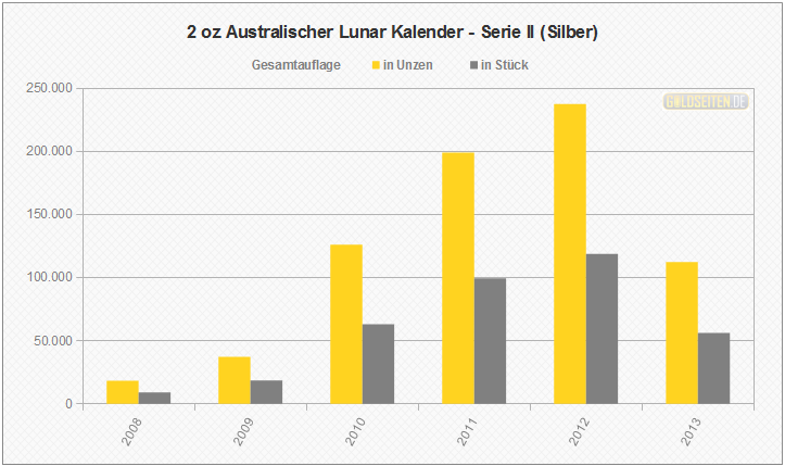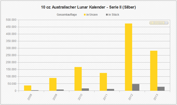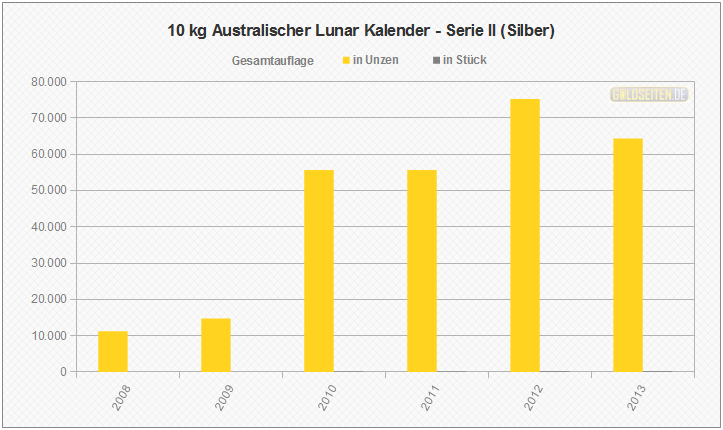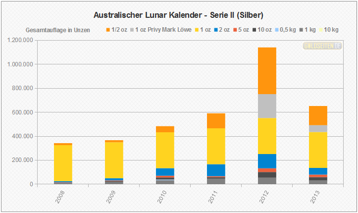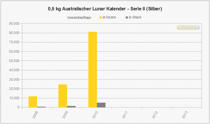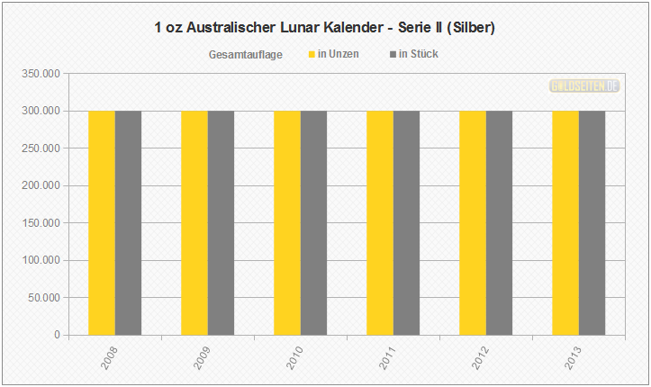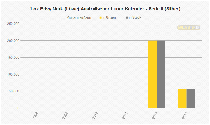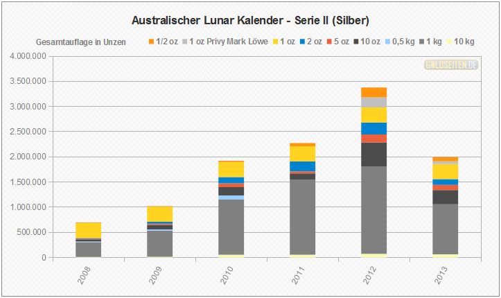 Legende/Erklärung: Die Australischen Lunar Silbermünzen der "Serie II" (aktuelle Preise) werden seit dem Jahr 2008 parallel zur Goldversion von der Perth Mint geprägt und knüpfen an den Erfolg der ab 1999 ausgegebenen ersten Serie an. Die Statistik der Australischen Lunar Silbermünzen basiert auf Veröffentlichungen der staatlichen Münzprägestätten. Unberücksichtigt blieben bis auf eine Ausnahme (die 1 oz Lunar-Silbermünze mit Privy Mark "Löwe") alle Sonderauflagen oder etwaige Proof-Versionen.