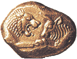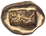 Der sagenhaft reiche König Kroisos war der erste, der Münzen in purem Gold nach ihm "Kroiseios" genannt prägen liess. Die Vorderseite zeigt das Wappen des Herrschers: Auf der rechten Seite ist ein Stiervorderteil zu sehen, dem ein Löwenvorderteil zugewandt ist. Die Rückseite ist in den Anfängen noch bildlos (in der Fachsprache "quadratum incusum" genannt) und weist auf die Prägetechnik hin: Ein Eisen, das eine rauhe Oberfläche besass, um das Abrutschen zu verhindern, wurde auf den Schrötling auf den Verderseitenstempel aufgelegt worden war, aufgesetzt, und durch einen kräftigen Hammerhieb entstand daraus eine Münze.