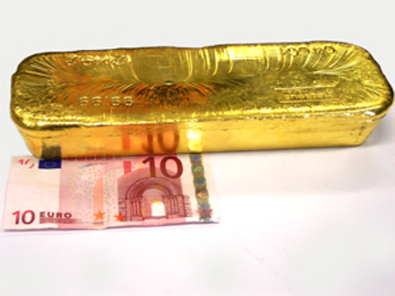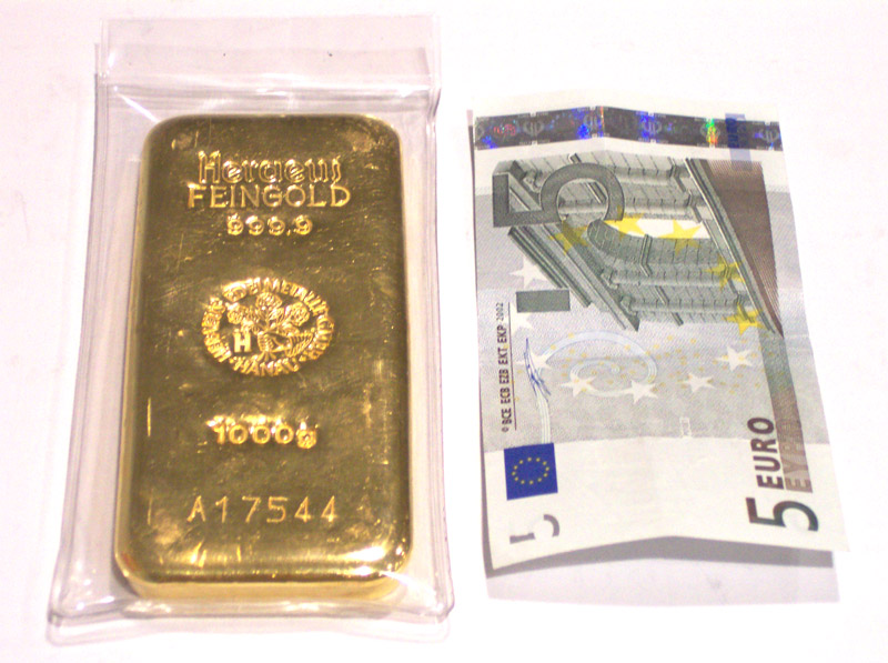 12,5-kg-Standard-Goldbarren (Heraeus), 10-Euro-Geldschein
