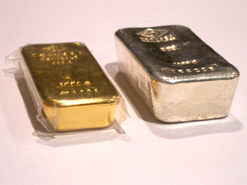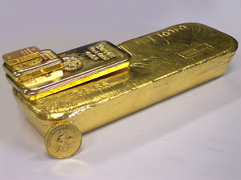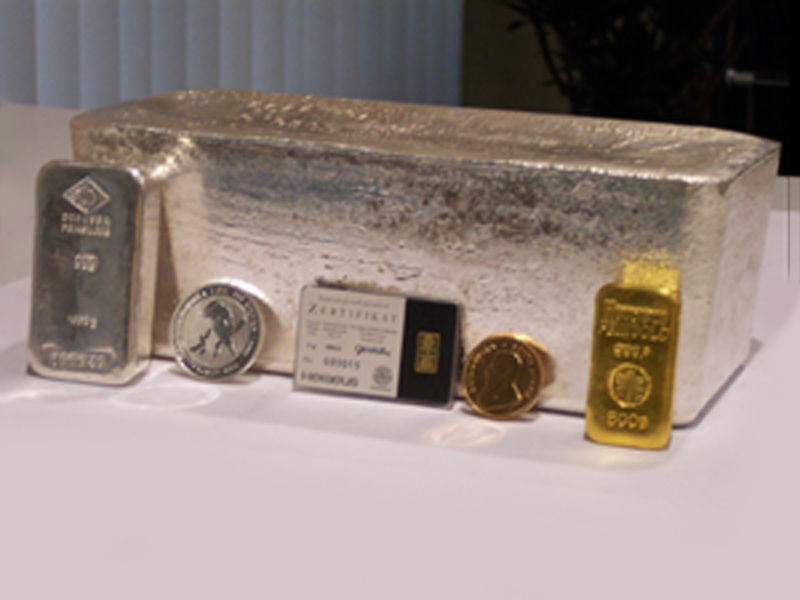 |  1-kg-Silberbarren (Degussa), 1-oz-Münze Kookabura, 1-g-Goldbarren mit Zertifikat (Heraeus), 1-oz-Krügerrand, 500-g-Goldbarren (Heraeus) angelehnt an einen 30-kg-Standard-Silberbarren