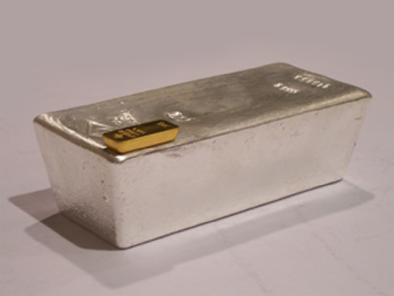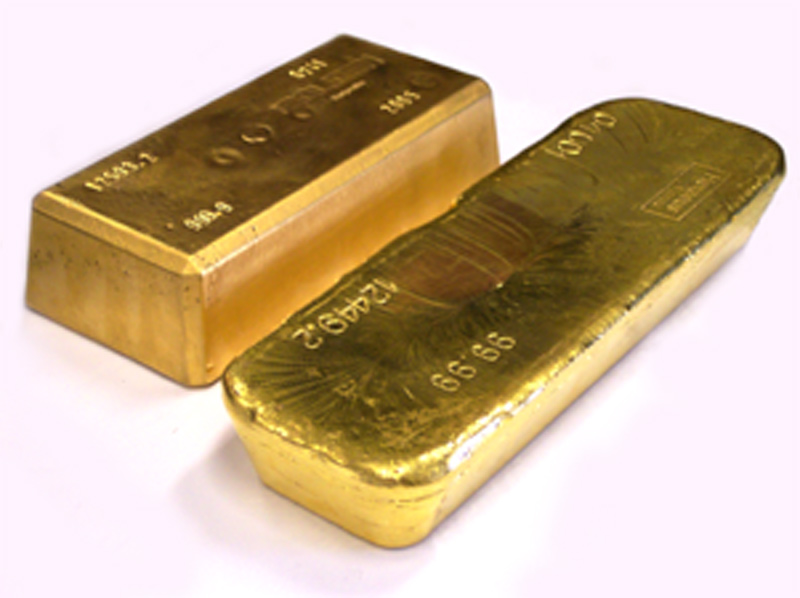 |  400-oz- (ca. 12,5 kg) Standard-Goldbarren (Boliden aus Schweden und Heraeus aus Deutschland)