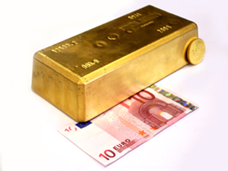|  1-€-Münzstück, 1-kg-Goldbarren (Heraeus und Degussa)