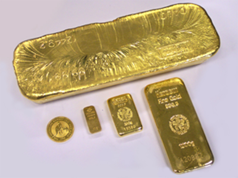 50-g- (Degussa, alte Form), 250-g- und 1-kg-Goldbarren, 12,5-kg-Standardbarren (alle Heraeus), 1-oz-Känguru