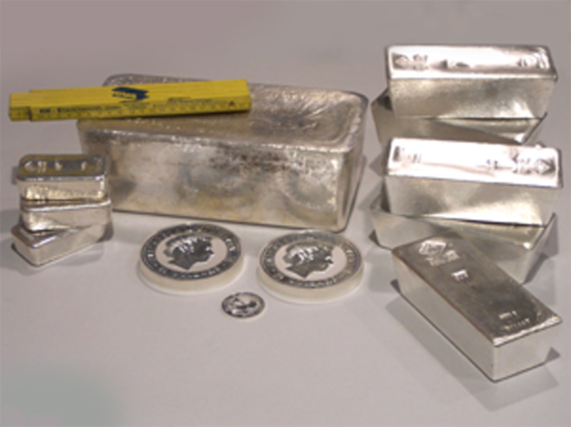 |  Silber: 1-kg-Barren (Degussa), 30-kg-Standardbarren (KGMV) darauf ein Zollstock, 5-kg-Barren, 1-kg- und 1-oz-Kookabura-Münzen