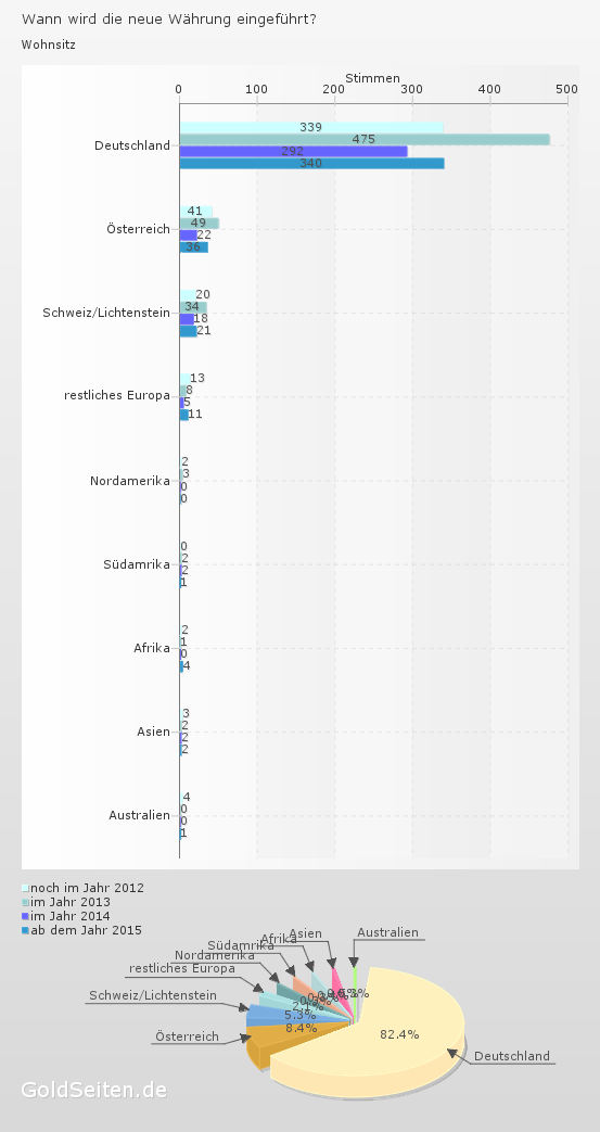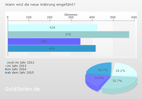 In der Umfrage vom 03.05.2012 hatten wir Sie unter der theoretischen Annahme, dass es anstatt zu einer Währungsreform in den nächsten Monaten "nur" zu einer Währungsumstellung kommt, gefragt, welche Variante Ihrer Meinung nach die sinnvollste wäre. Die Antwortmöglichkeiten waren: eine "Neue DM", die Trennung in einen "Nord- & Süd-Euro", eine Fusion "US-Dollar mit dem Euro" und ein "bleibender Euro", wie er aktuell existiert.